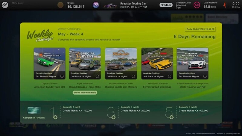 A última semana de maio chega acelerando no Gran Turismo 7, trazendo uma nova seleção de cinco corridas que misturam diversão, nostalgia e potência. Entre os destaques estão o evento especial com o Renault Kangoo, a estreia da Ferrari Circuit Challenge adicionada na atualização 1.59 e mais uma rodada da clássica World Touring Car 700.
