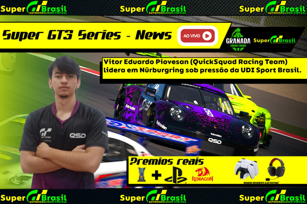 A terceira etapa da Divisão A do Super GT3 colocou Nürburgring GP no centro das atenções e entregou exatamente o que os GTzeiros esperam: ritmo forte, leitura fina de tráfego e decisões estratégicas que definem corridas grandes. Em noite de internet instável no país, a operação da Super GT Brasil segurou firme, reiniciou o lobby quando preciso e levou a prova ao verde. Na pista, Vitor Eduardo Piovesan (V. Piovesan), da Quick Squad Racing Team (QSD), apostou numa condução cirúrgica de Corrida Duro (Racing Hard) sem paradas e levou a vitória. Anderson Ferreira Pinho (UDI-ANDERSON), da UDI Sports Brasil, perseguiu com pneus mais velozes e registrou a volta mais rápida, enquanto Nicolas Amorim Chaves (UDI_SHOCK), também da UDI Sports Brasil, completou o pódio após um undercut certeiro.