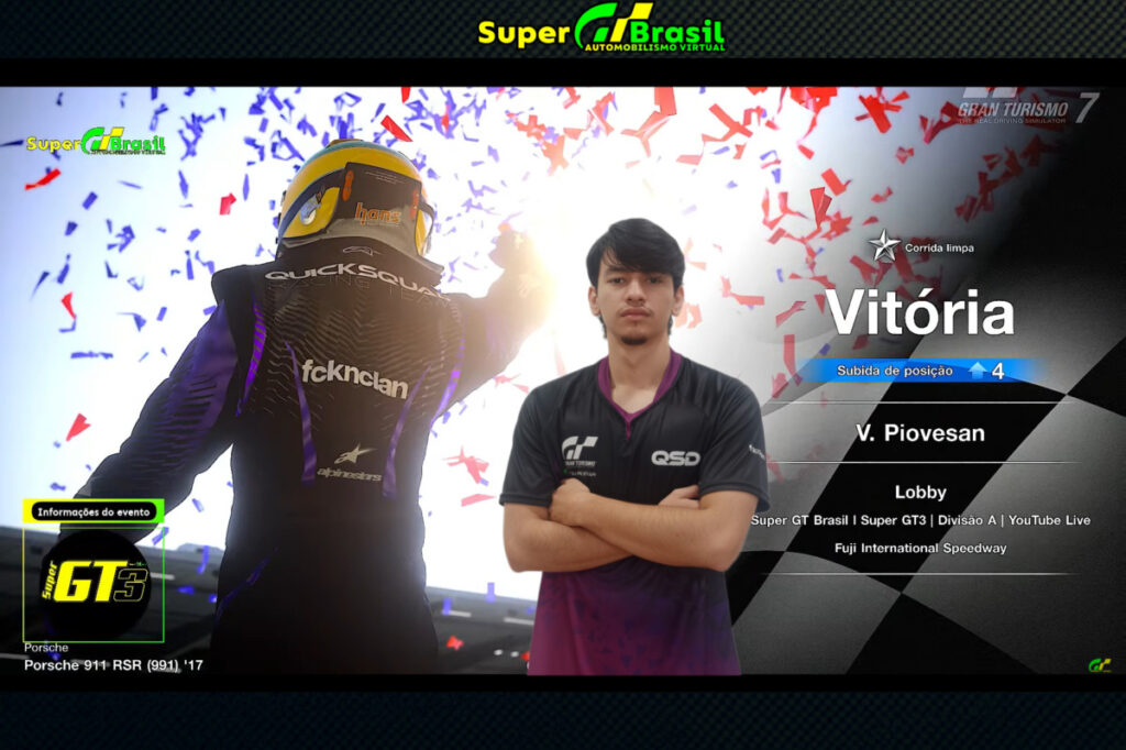 A Super GT Brasil, maior potência do sim-racing na América Latina, foi palco de mais uma performance de gala de Vitor Eduardo Piovesan (V. Piovesan). O piloto da Quick Squad Racing Team (QSD) não apenas venceu; ele dominou a mente dos adversários com uma estratégia ousada de “zero paradas”, cruzando a linha de chegada praticamente com o “cheiro da gasolina”.