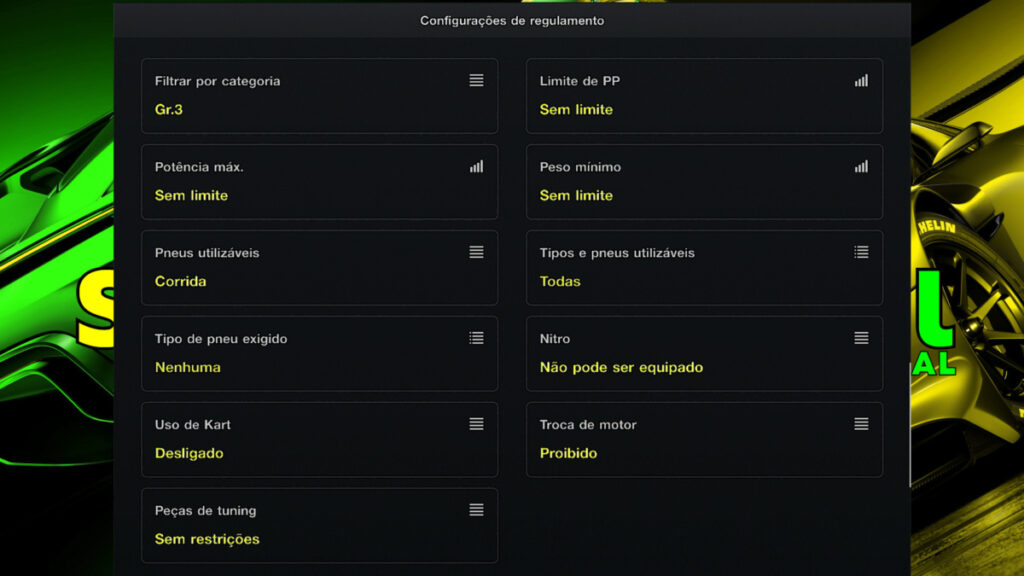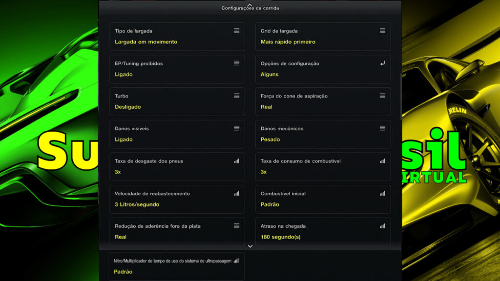Institucional Super Porsche Cup – Configurações Oficiais de Lobby e Corrida por Flavio Bode 30 de outubro de 2025 escrito por Flavio Bode 30 de outubro de 2025 marca páginas 4 Definido e atualizado em 30/10/2025 Automobilismo VirtualBalanceamento dos FreiosBoP AtivadoCampeonato Monomarcacampeonato onlineClima DinâmicoConfigurações de CorridaConfigurações Oficiais SGTBCorrida VirtualDivisão ADivisão BDivisão CDivisão DFair PlayGran Turismo 7Largada em MovimentoLiga Brasileira de GT7Lobby OficialPenalidades GT7Porsche 911 RSR Gr.3PS5 Gran TurismoRegras de CorridaRegulamento TécnicoSetup FechadoSimracing BrasilSuper GT Brasilsuper porsche cup Flavio Bode Seguindo o Autor Entusiasta do automobilismo real e virtual, até assiste formula 1 mas prefere qualquer categoria de menor relevância midiática. Deixe um comentário Cancelar respostaVocê precisa fazer o login para publicar um comentário. Post anterior Super Porsche Cup 2025 – Calendário Oficial Você também pode gostar Super Porsche Cup 2025 – Calendário Oficial 30 de outubro de 2025