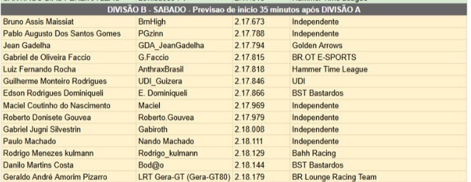 Se a A promete sprint no limite, a Divisão B chega com equilíbrio amplo e muitos pilotos com perfis complementares. Jean Gadelha (GDA_JeanGadelha), da Golden Arrows, aparece como nome de referência para ditar o ritmo na parte média-alta do pelotão, enquanto Gabriel de Oliveira Faccio (G.Faccio) representa a BR.OT E-SPORTS com pace sólido em classificação. Guilherme Monteiro Rodrigues (UDI_Guzera) carrega a bandeira da UDI e tende a crescer em corrida longa, principalmente se houver variação de estratégia de pneus. A Hammer Time League coloca Luiz Fernando Rocha (AnthraxBrasil) na briga direta por pódio, muito forte em retomadas pós-pit. Entre os independentes, Bruno Assis Maisais (BrnHigh) e Pablo Augusto dos Santos Gomes (PGzin) mostraram tempos consistentes, compondo um bloco que deve definir posições no detalhe das entradas e saídas de boxes.