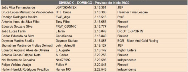 A Divisão C entra em cena no domingo e mantém a filosofia de separação por desempenho, garantindo brigas justas em todos os níveis de habilidade. João Vitor Fernandes (JGP/OKAMIX) representa a JGP e chega com preparação cuidadosa de stint, mirando topo do grid em ritmo de prova. A família Hammer Time League aparece com Bruce Lopes Miekusz de Vasconcellos (HTL_Bruc), conhecido pela evolução em corrida e leitura de tráfego. A Firewolf surge com dupla forte: Antonio Iure da Silva Filho (Tony_Filho) e Eduardo Souza e Silva (FRW_COSMIC), pilotos de toque limpo e constância que crescem volta a volta. Nomes como Rodrigo Rodrigues Ferreira (FV46_digo) e Carlos Eduardo da Silva (CarloSenna) completam um cenário promissor, mostrando que a etapa tem profundidade competitiva em toda a pirâmide.