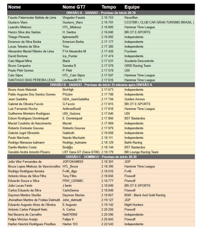 O Grid A reúne nomes que vêm construindo trajetória sólida dentro da comunidade, além de estreantes rápidos que já mostraram serviço na tomada de tempos. Gustavo Viaro (Gustavo_Viaro), da CCGTBR (Club Car Gran Turismo Brasil), aparece entre os mais velozes e carrega expectativa de liderança por ritmo e regularidade. Leandro Miekusz (HTL_Miekusz), representante da Hammer Time League, chega em excelente forma e costuma crescer em stint longo, detalhe que pode decidir a corrida. Outro destaque é Henzo Silva dos Santos (H. Santos), ligado à BR.OT E-SPORTS, que tem histórico de constância e leitura estratégica de parada de boxes. Fechando o pelotão de favoritos, Bruno Cerqueira (Soneka B), da GRID Racing Team, e a dupla Paulo Pleti Gomes (P. Pleti) e Caio Sipos (HTL_Caio Sipos), ambos Hammer Time League, aparecem com tempos muito próximos e potencial de pódio.