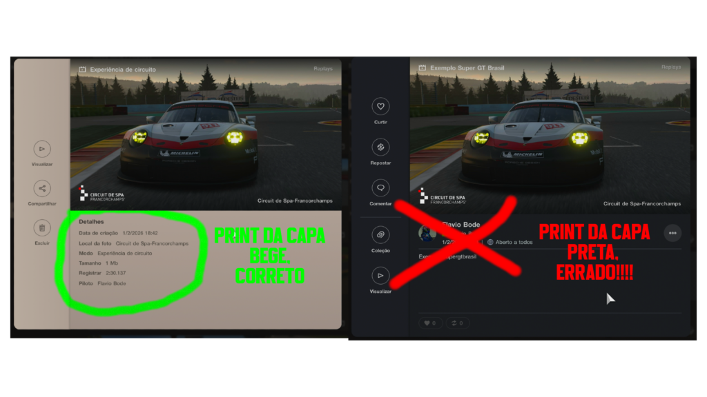 Para fins de validação, auditoria e homologação, somente serão aceitos replays salvos e compartilhados diretamente no Gran Turismo 7, por meio do sistema oficial do jogo (Showcase).