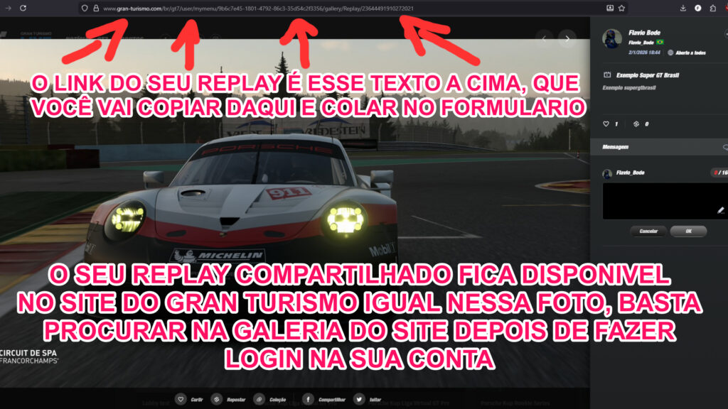 Após salvar e compartilhar publicamente o replay no Gran Turismo 7, o piloto deverá obter o link oficial do replay, que será utilizado para validação e auditoria da prova.